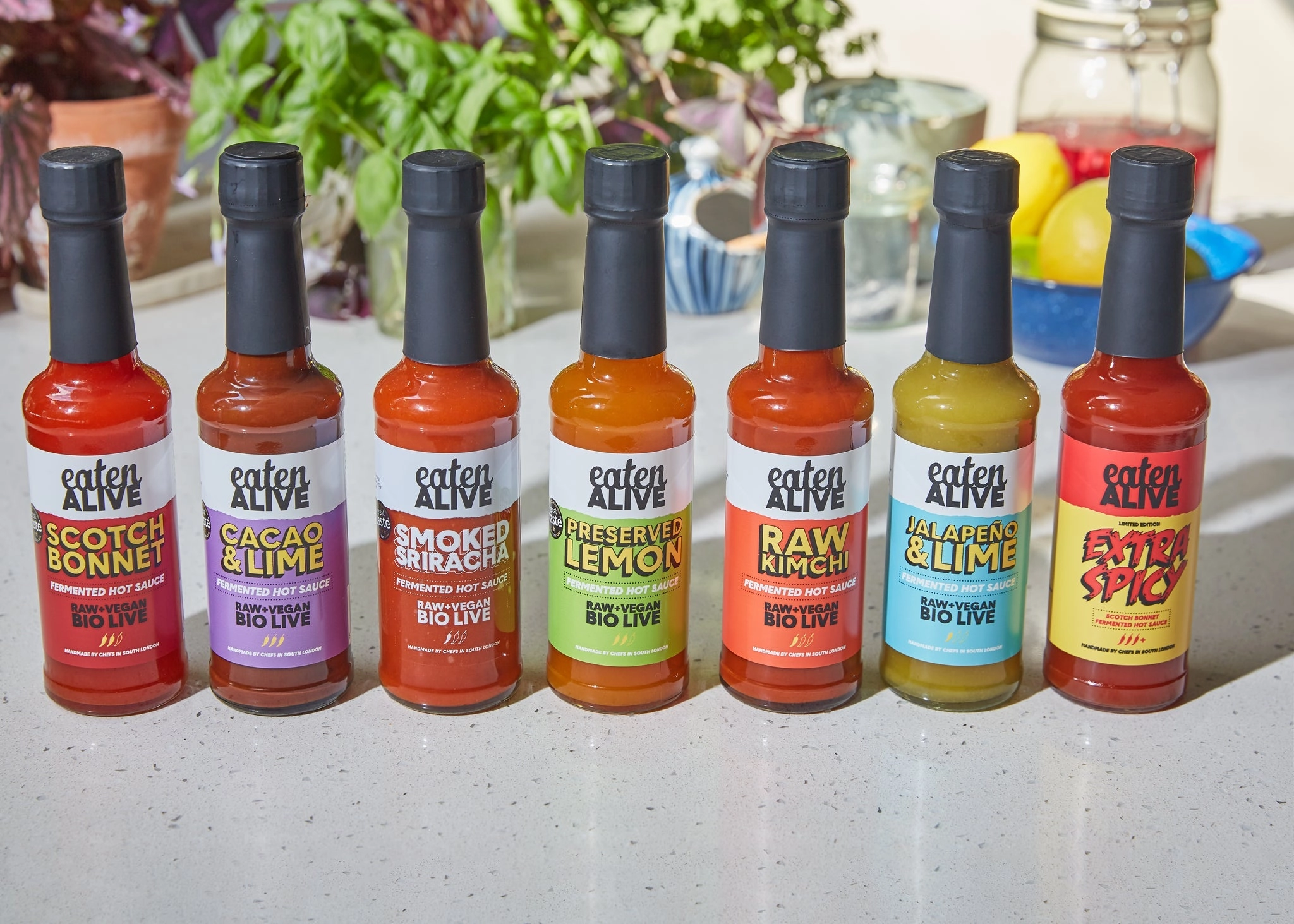A sauce for every occasion. All 7 of our multi-award winning, super delicious raw sauces in one perfect presentation pack. The hottest gift set! Varied heat and all with unique flavours, carefully crafted and fermented. This perfect gift for condiment lovers, spice freaks and foodies alike. Smoked Sriracha (the pop star), Scotch Bonnet (the classic), Cacao and Lime (the chefs special, deep and very savoury) and Preserved Lemon (the connoisseurs choice), Jalapeno and Lime (fresh and tangy), Raw Kimchi (our two great loves in one epic sauce) and Extra Spicy Scotch Bonnet (as full of flavour as it is heat!).